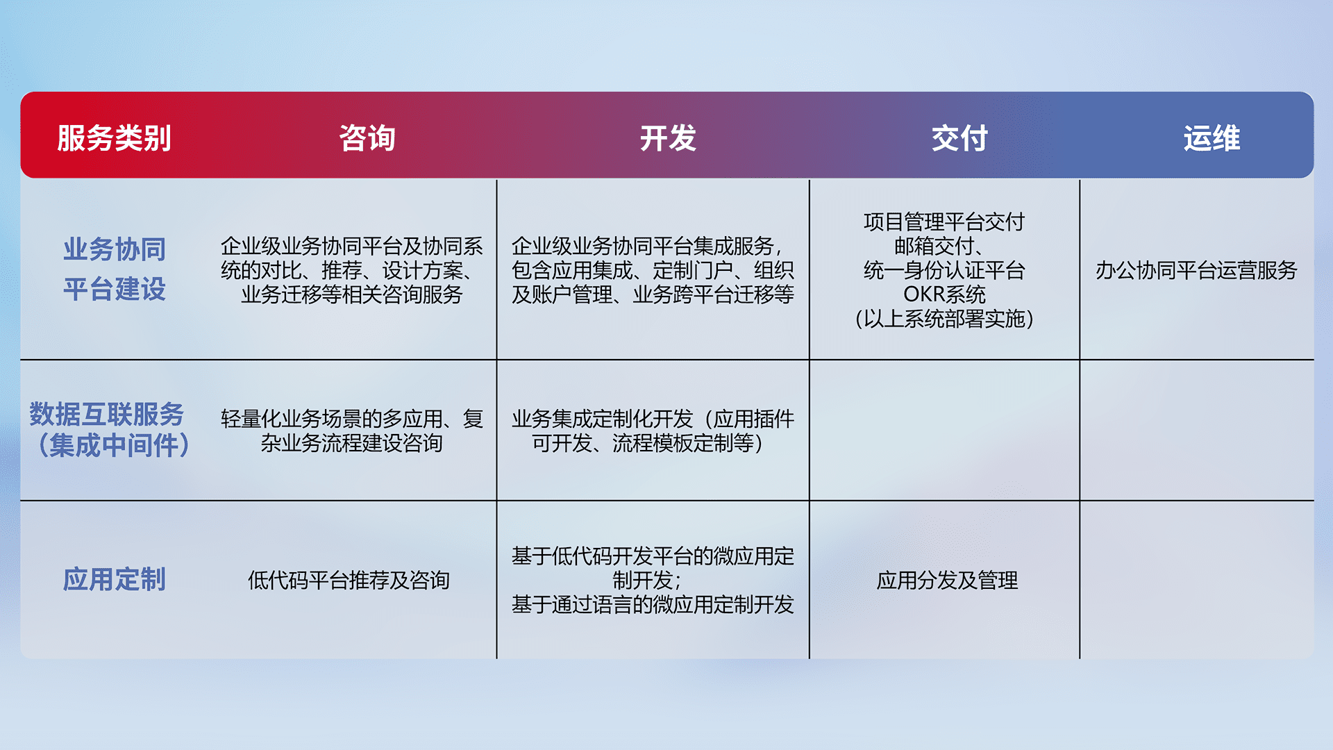 针对钉钉、、、、企微、、IDaas等平台级产品提供产品的规划、、方案、、交付、、、定制化开发等服务,,实现如统一协同办公、、、、智能客户服务、、、、混合会议管理、、、、智能数据查询、、等业务场景,,,,实现数字化转型。。。